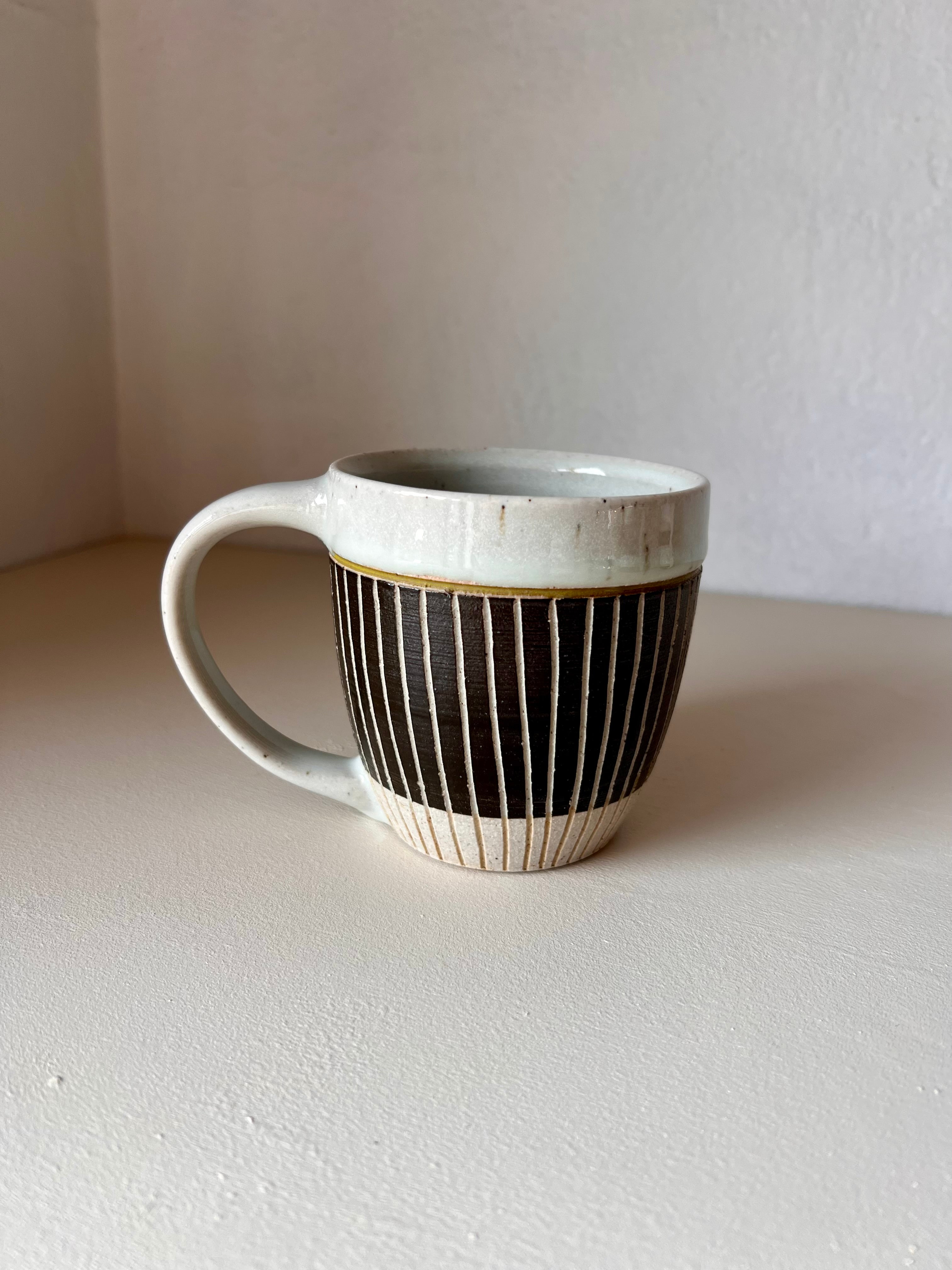 Wheel thrown stoneware, decorated with carving and slip. Finished with a Satin white glaze. Cone 10, gas reduction fired.