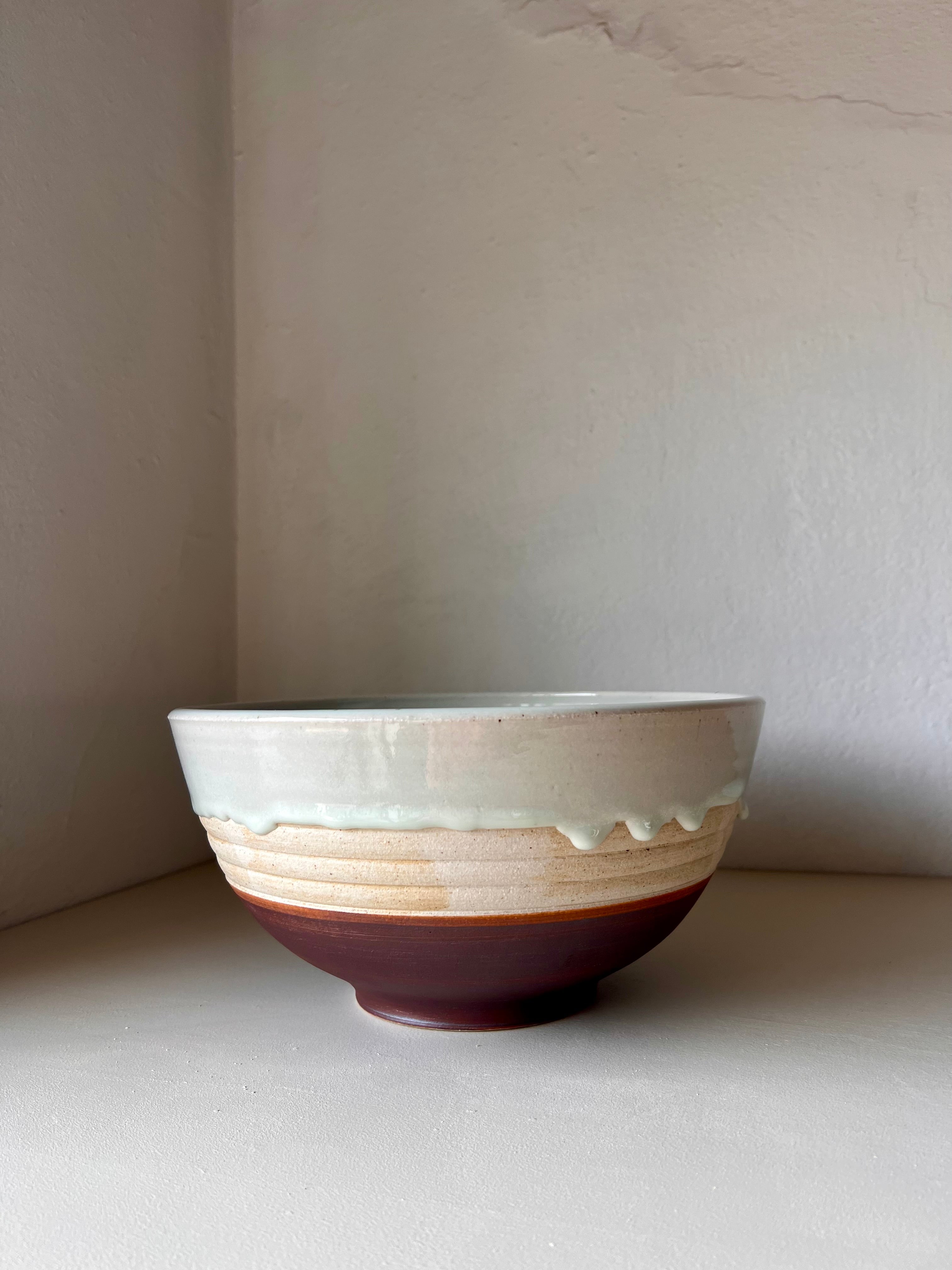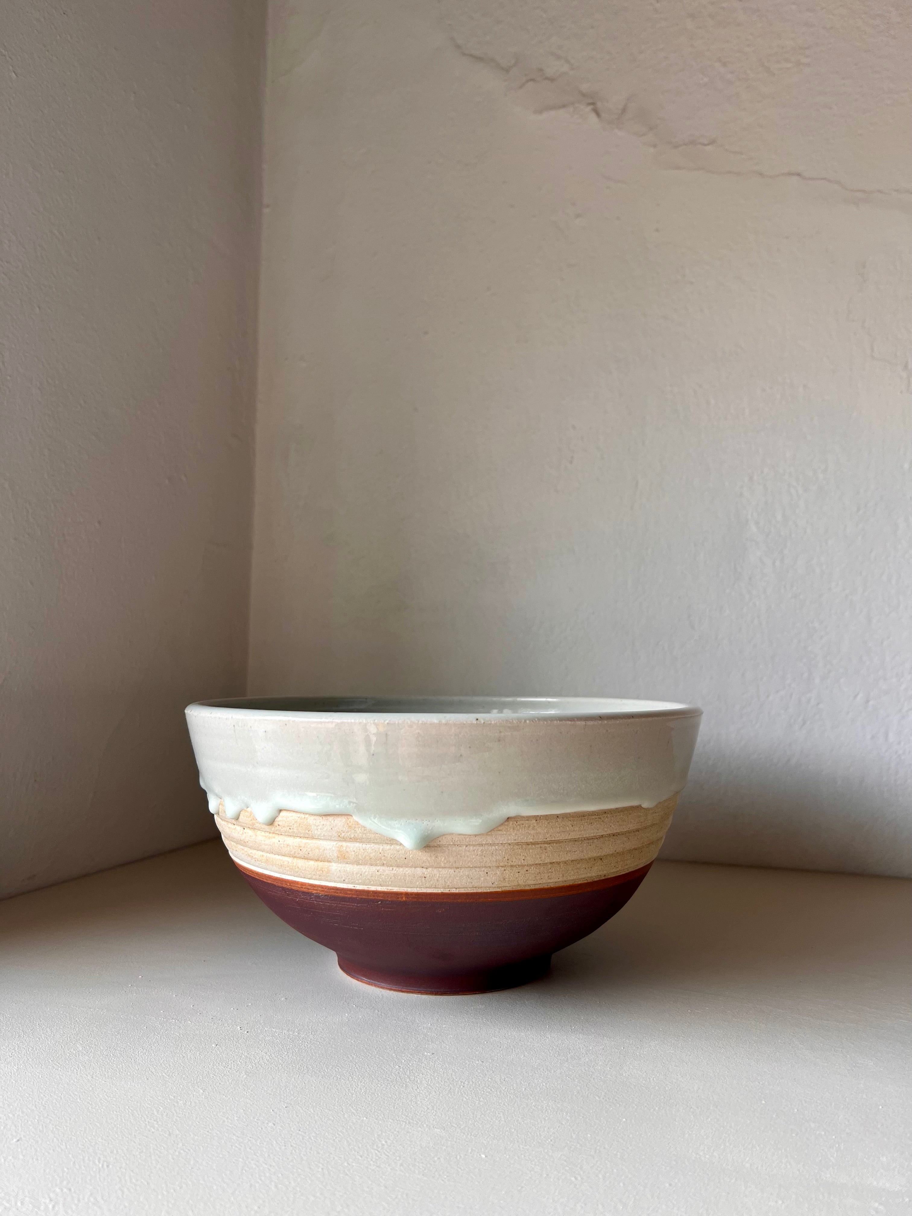 Wheel thrown stoneware, decorated with carving and slip. Finished with a glossy white interior. Cone 10, gas reduction fired.
