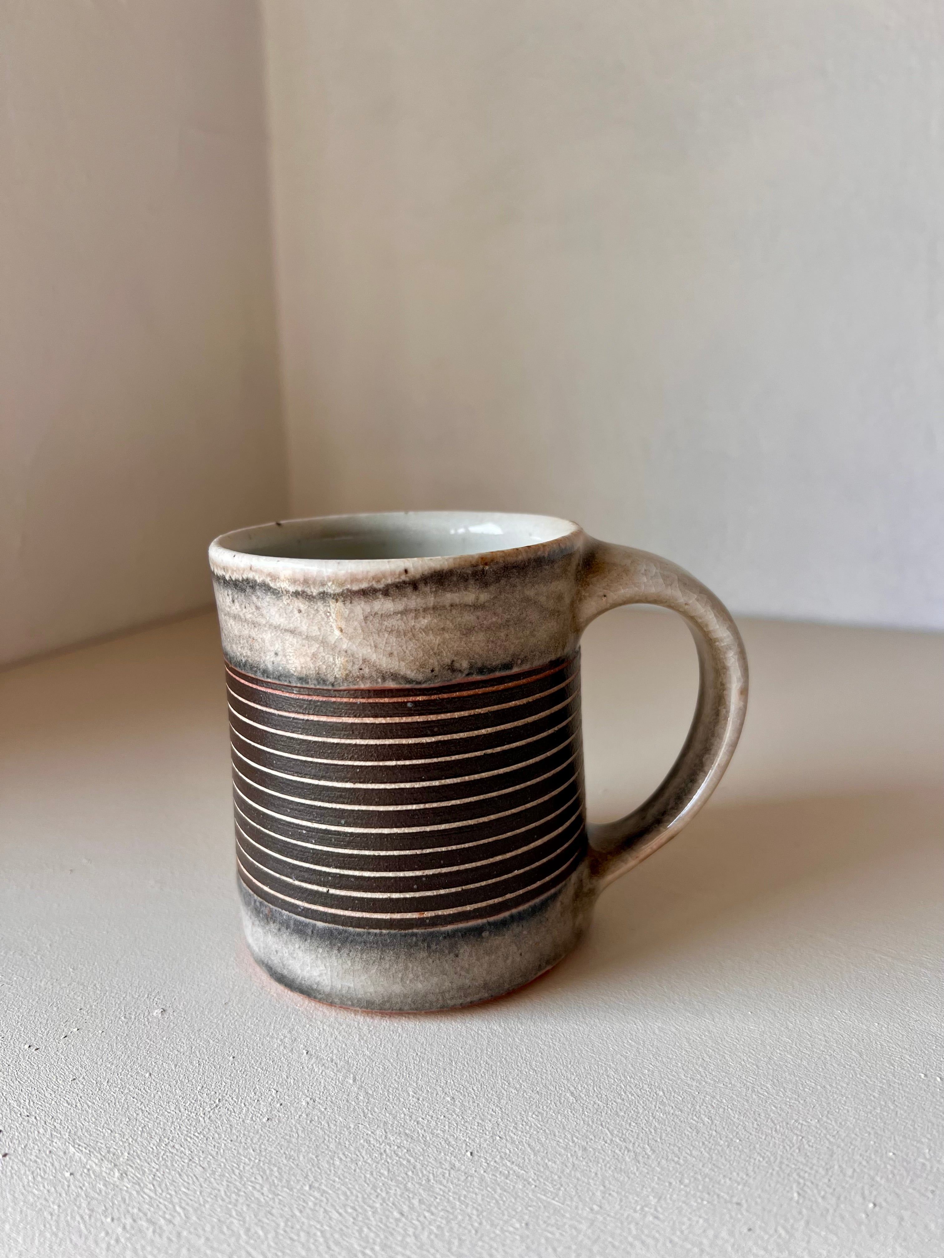 Wheel thrown stoneware, decorated with carving and slip. Finished with a shino glaze. Cone 10, gas reduction fired.