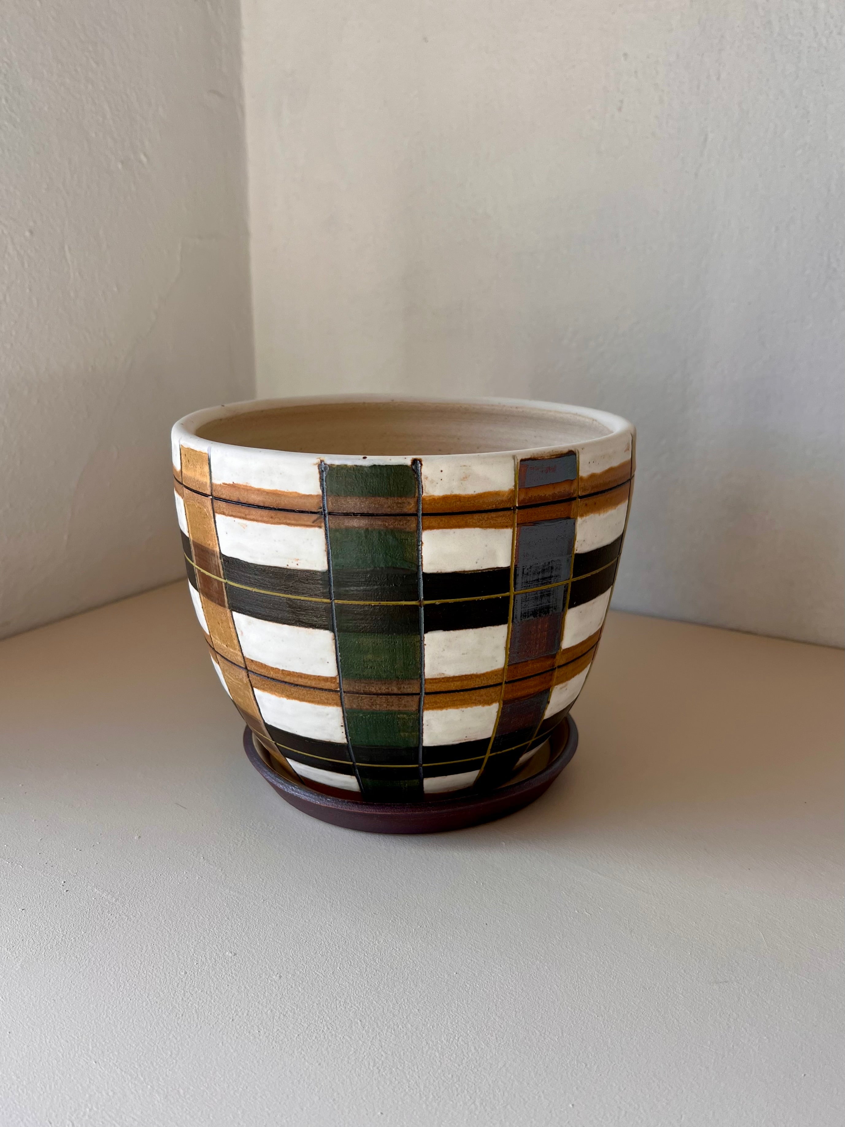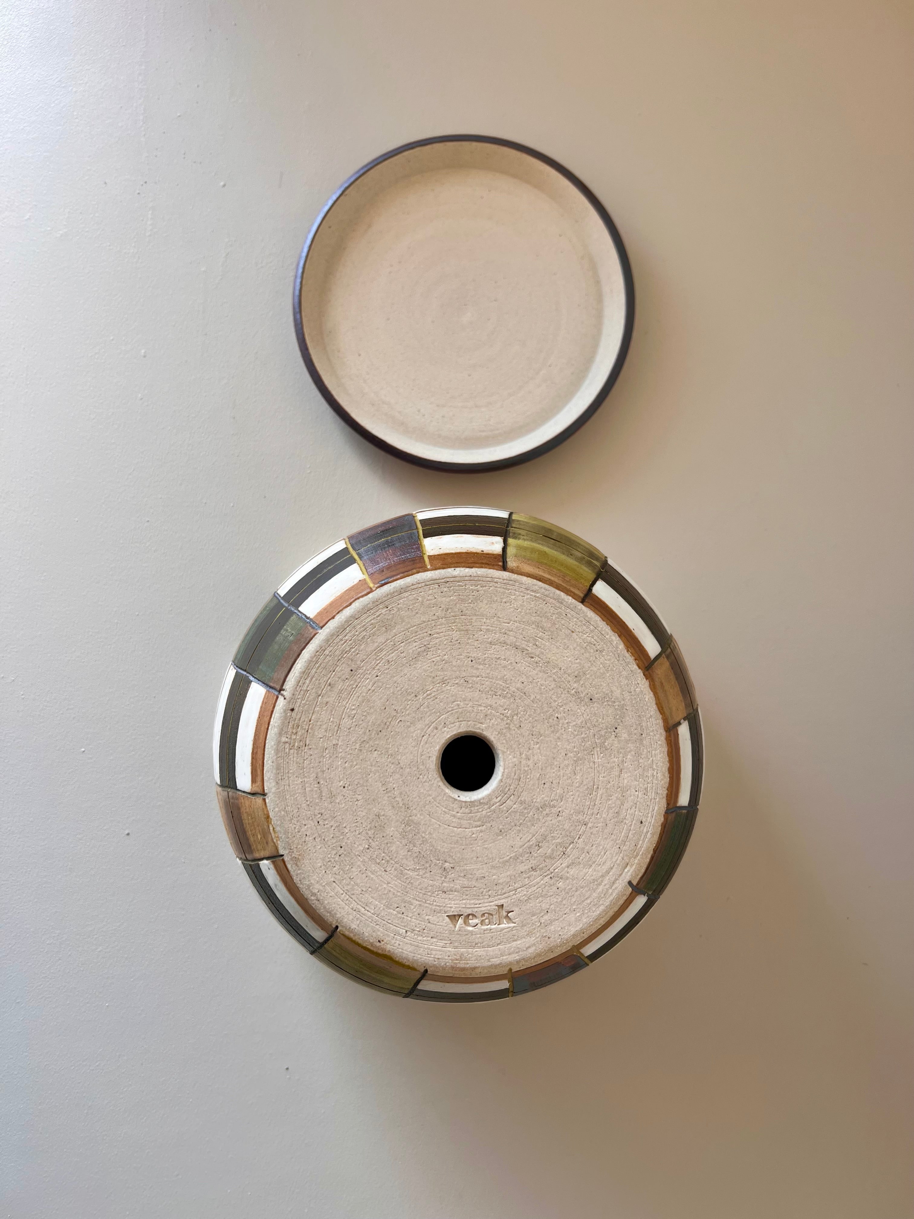 Wheel thrown stoneware, decorated with carving and slip. Finished with a satin, matte white glaze. Cone 10, gas reduction fired.