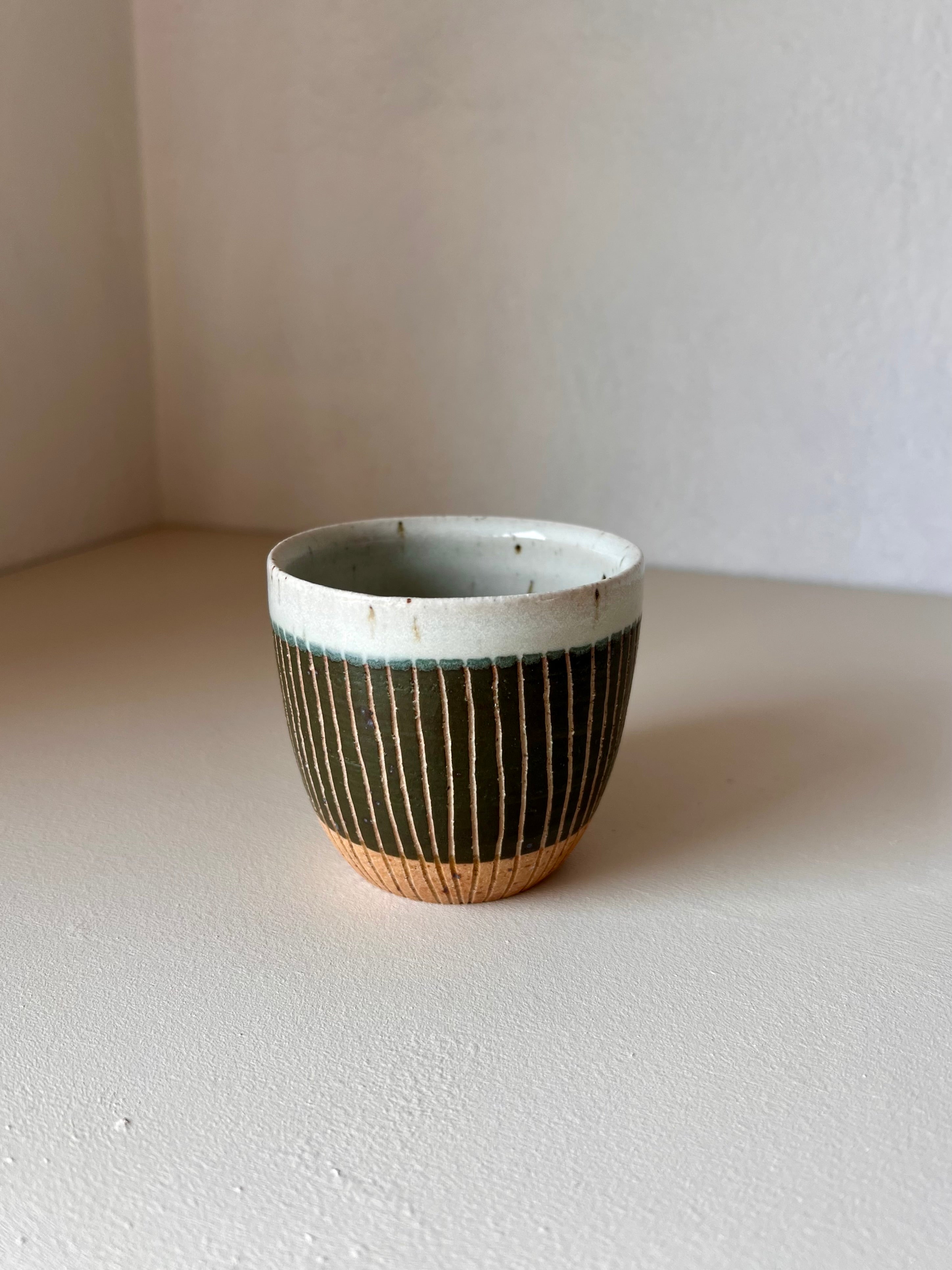 Wheel thrown stoneware, decorated with carving and slip. Finished with a glossy white interior. Cone 10, gas reduction fired.