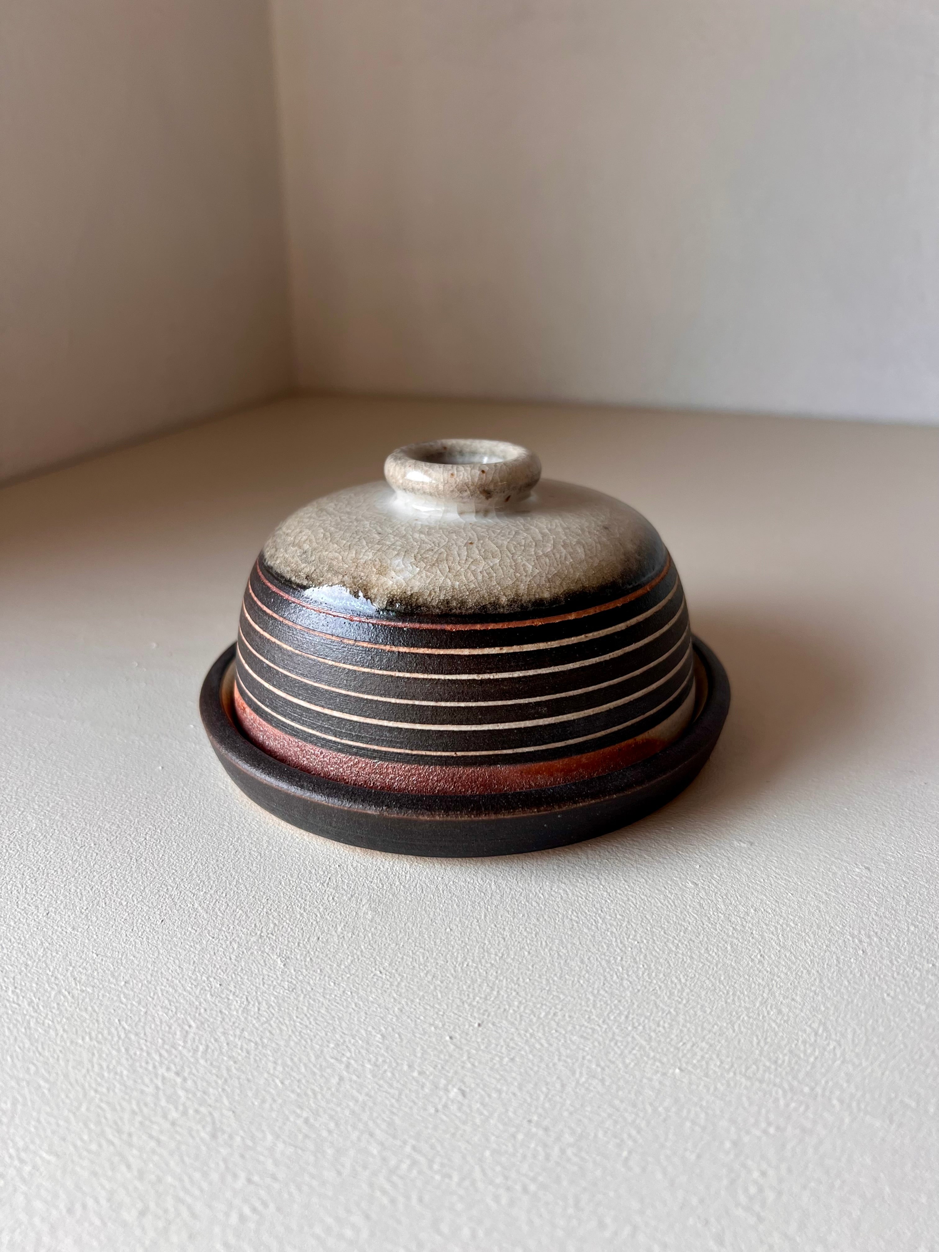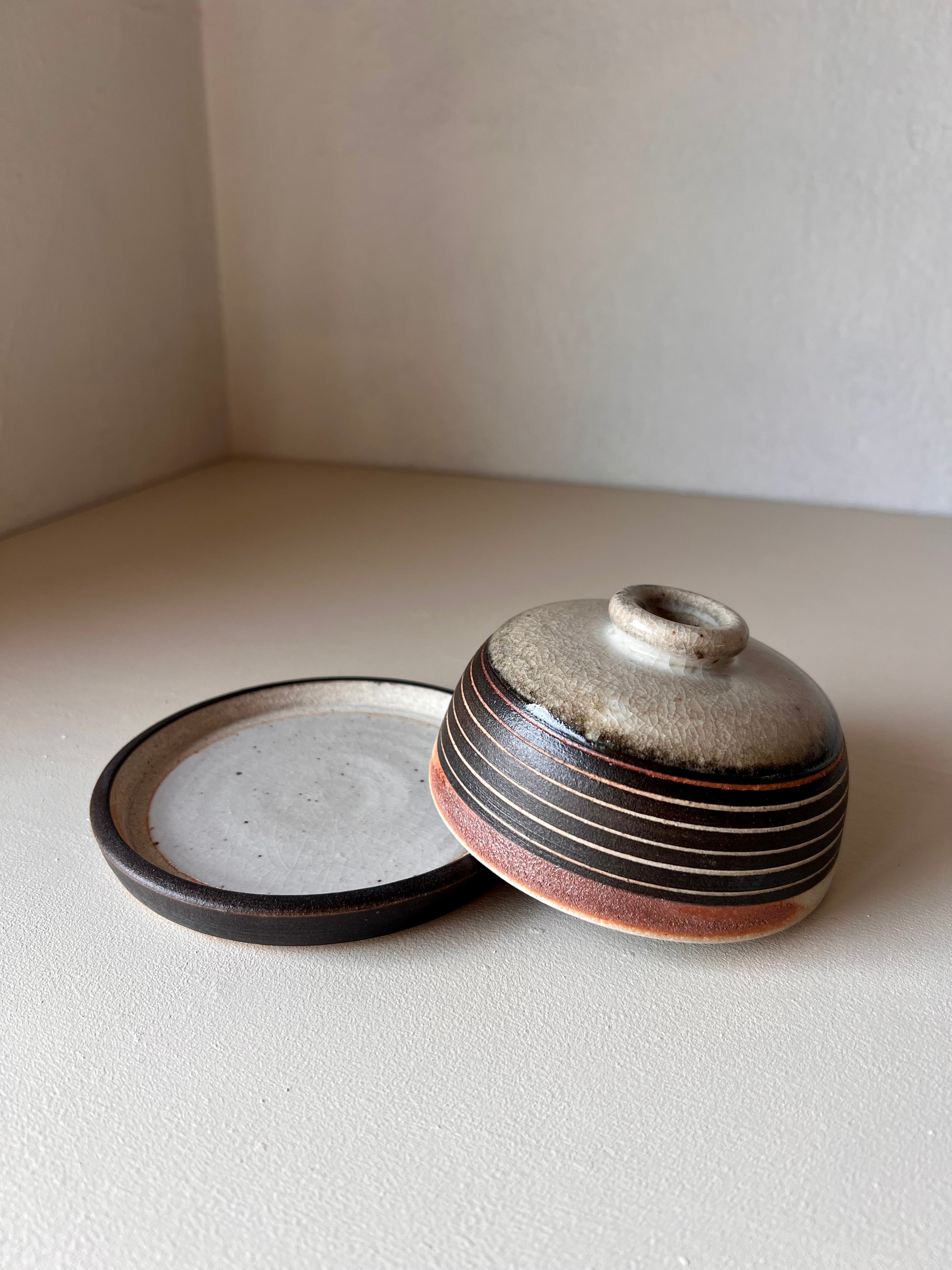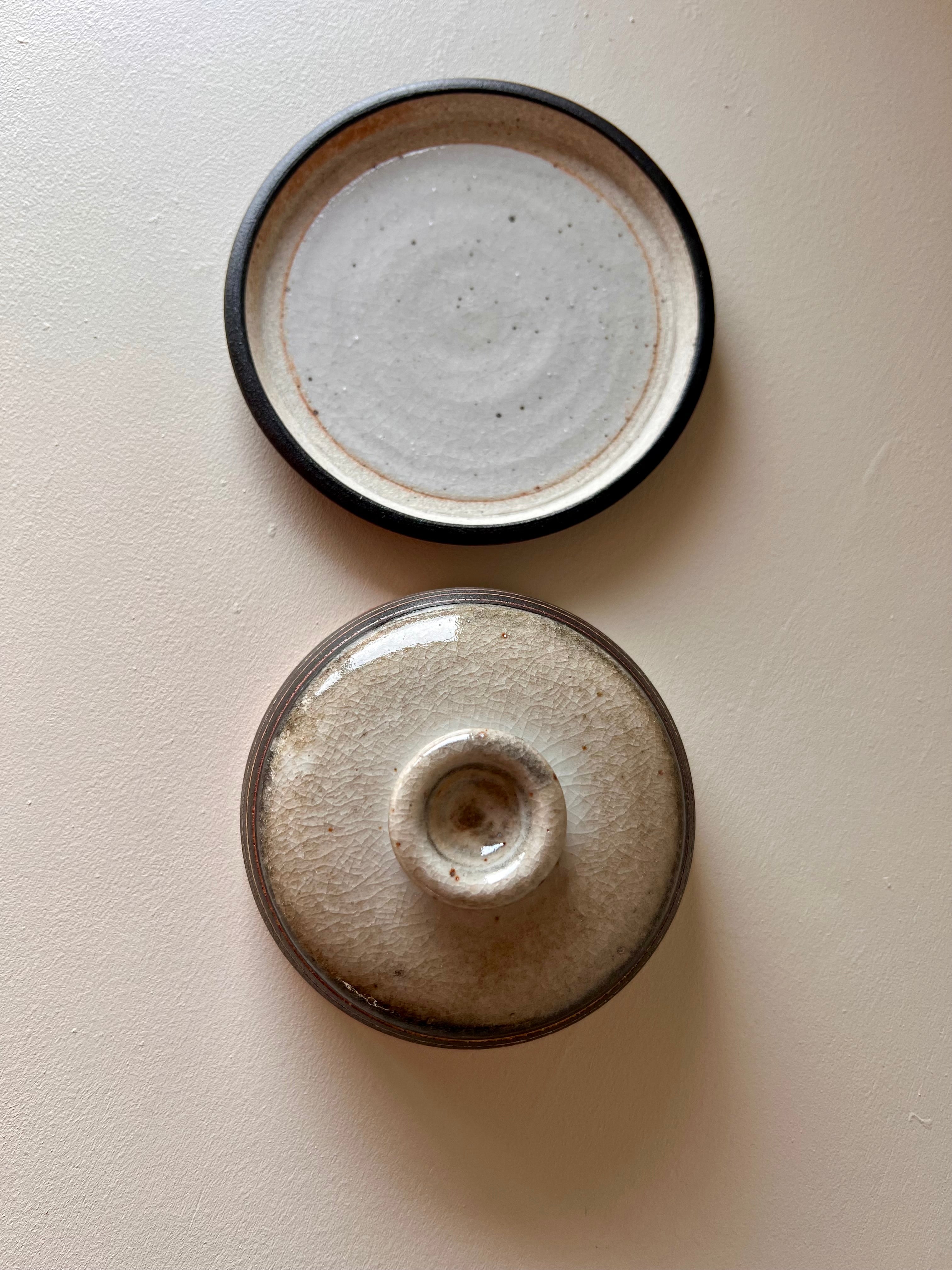 Wheel thrown stoneware, decorated with carving and slip. Finished with a Shino glaze. Cone 10, gas reduction fired.