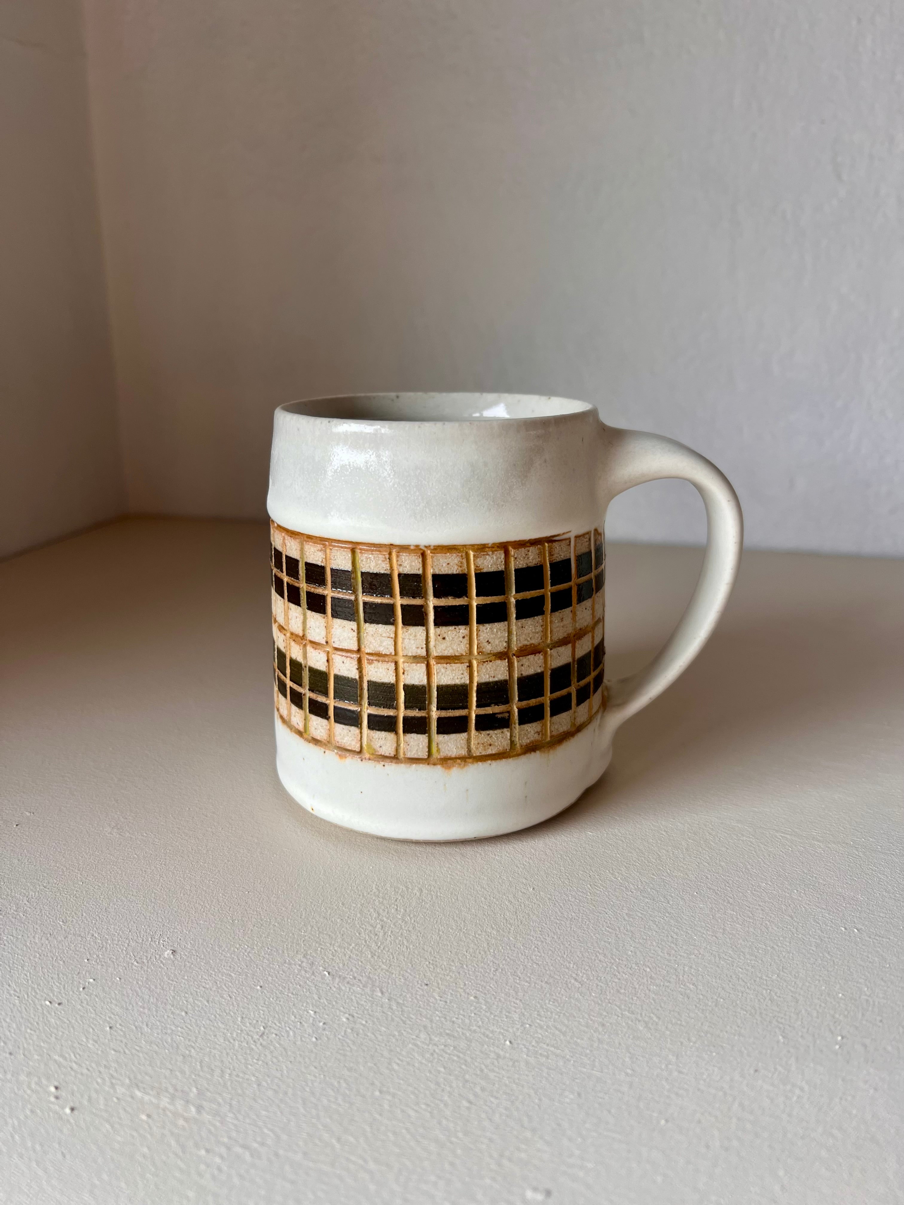 Wheel thrown stoneware, decorated with carving and slip. Finished with a Satin, matte white glaze. Cone 10, gas reduction fired.