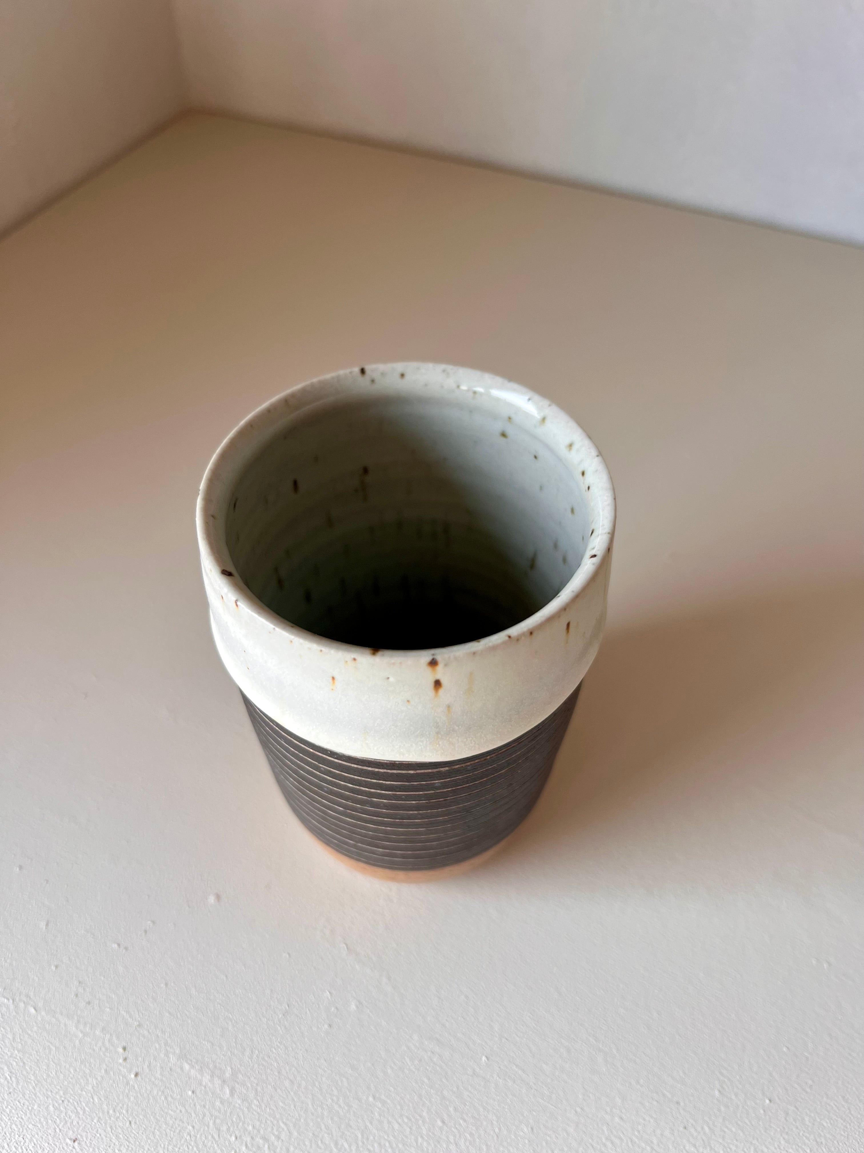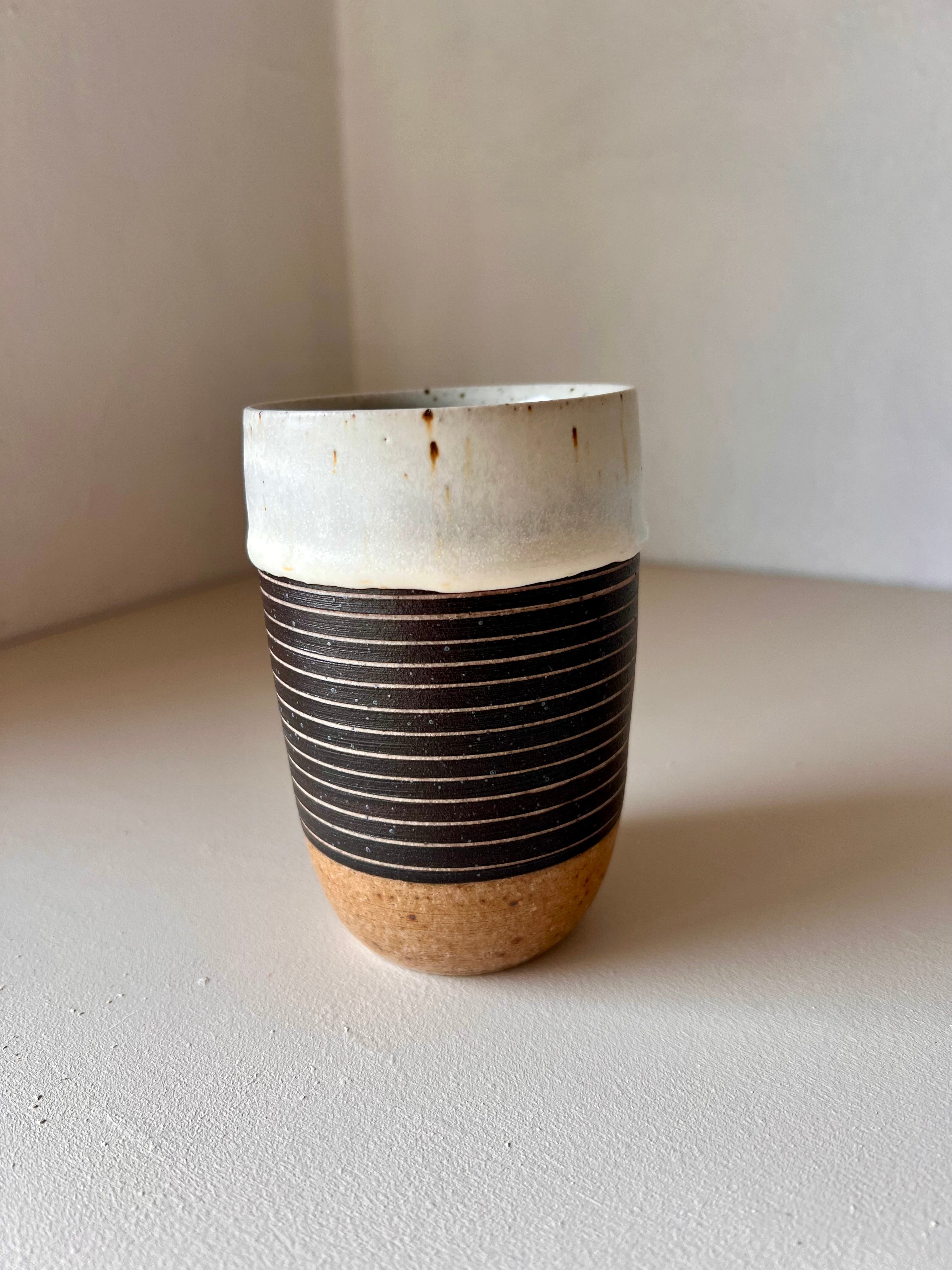 Wheel thrown stoneware, decorated with carving and slip. Finished with a satin matte glaze exterior and glossy white interior. Cone 10, gas reduction fired.