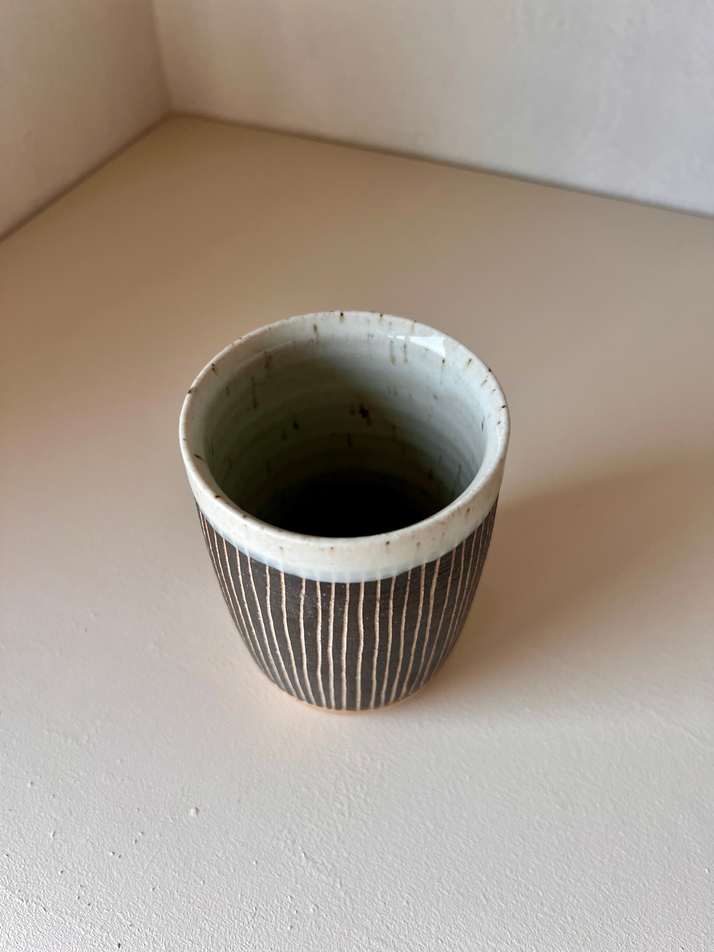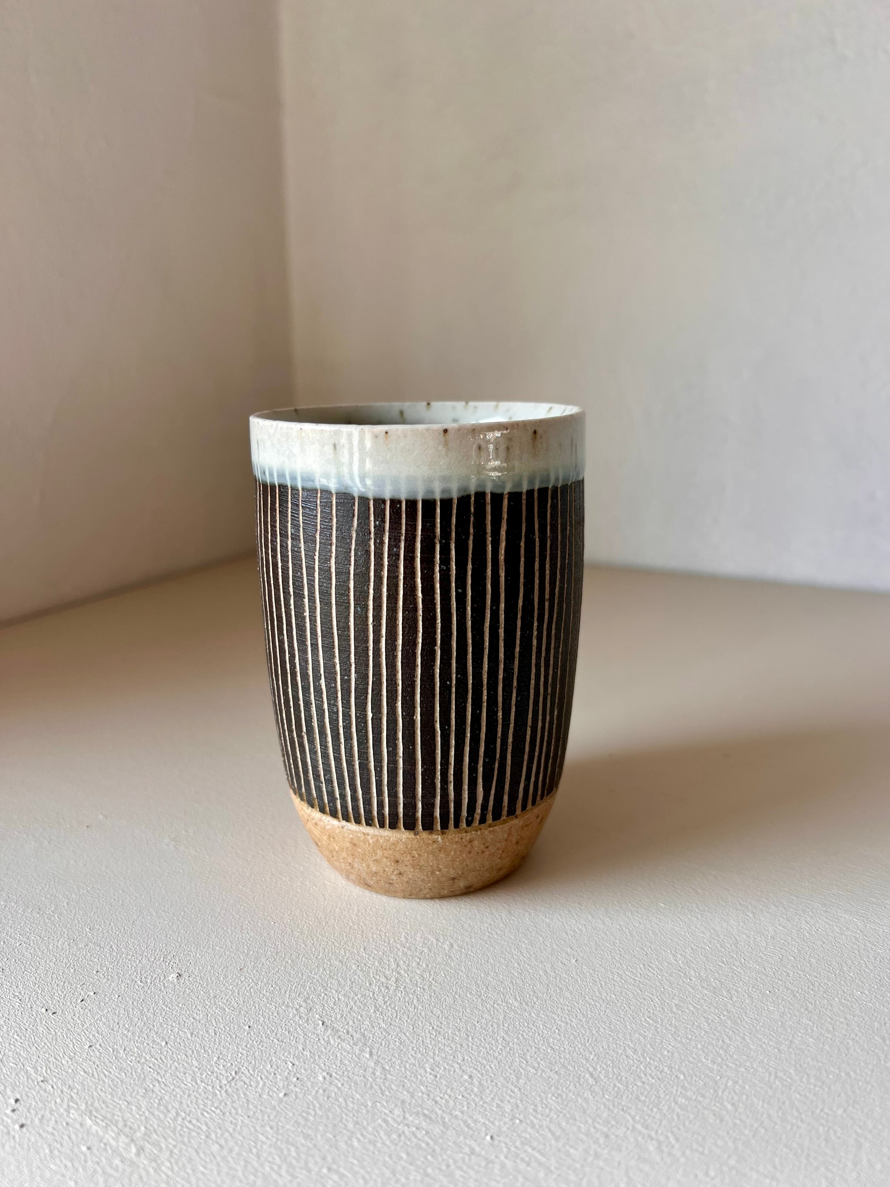 Wheel thrown stoneware, decorated with carving and slip. Finished with a glossy, white interior. Cone 10, gas reduction fired.