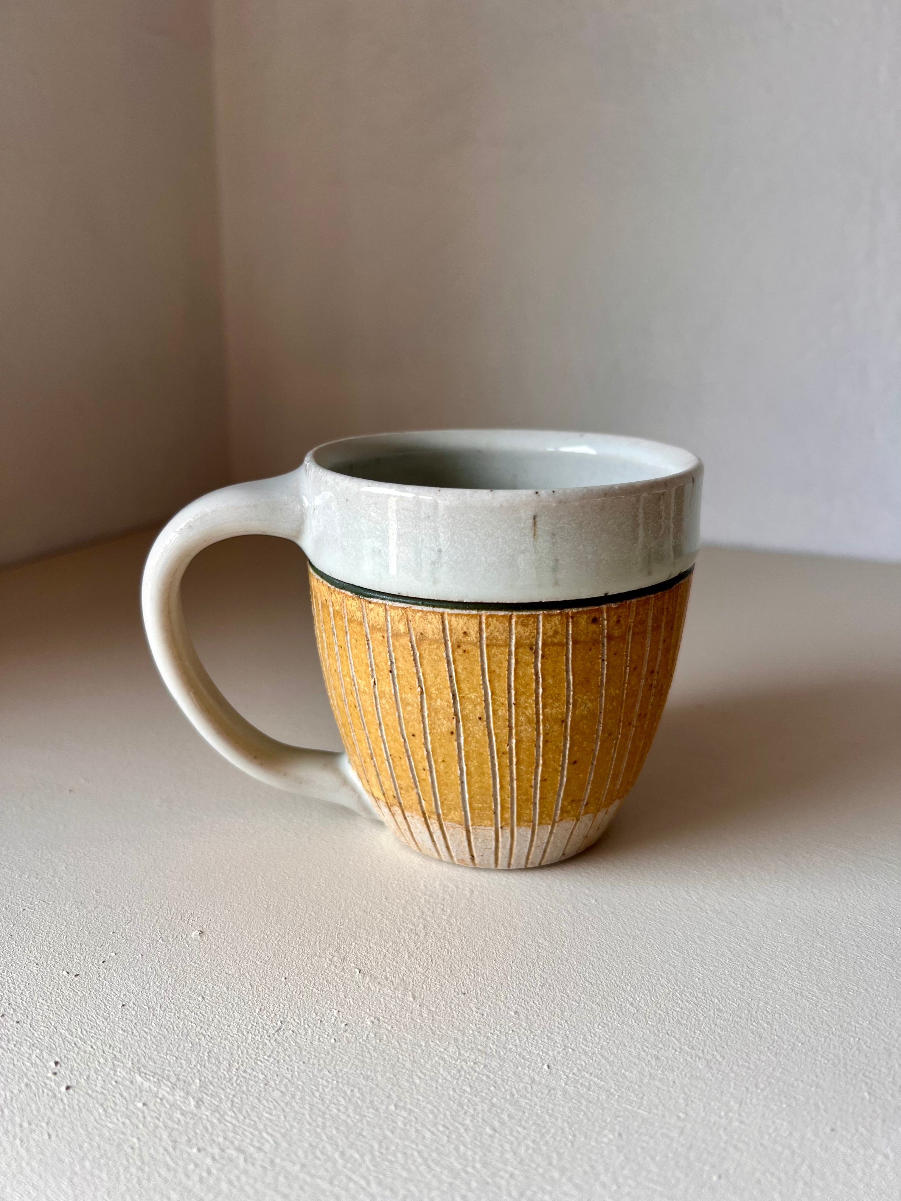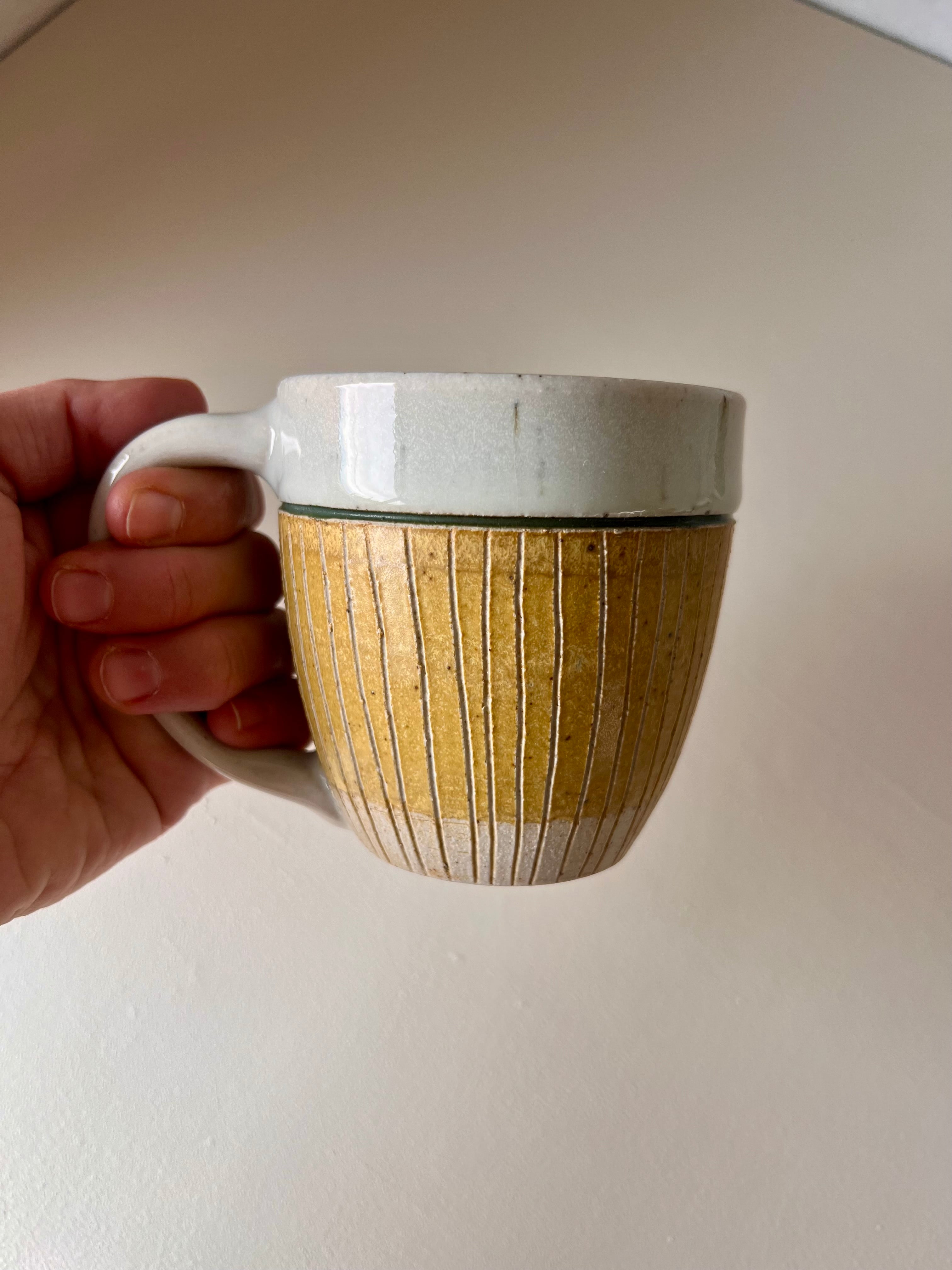 Wheel thrown stoneware, decorated with carving and slip. Finished with a Satin white glaze. Cone 10, gas reduction fired.