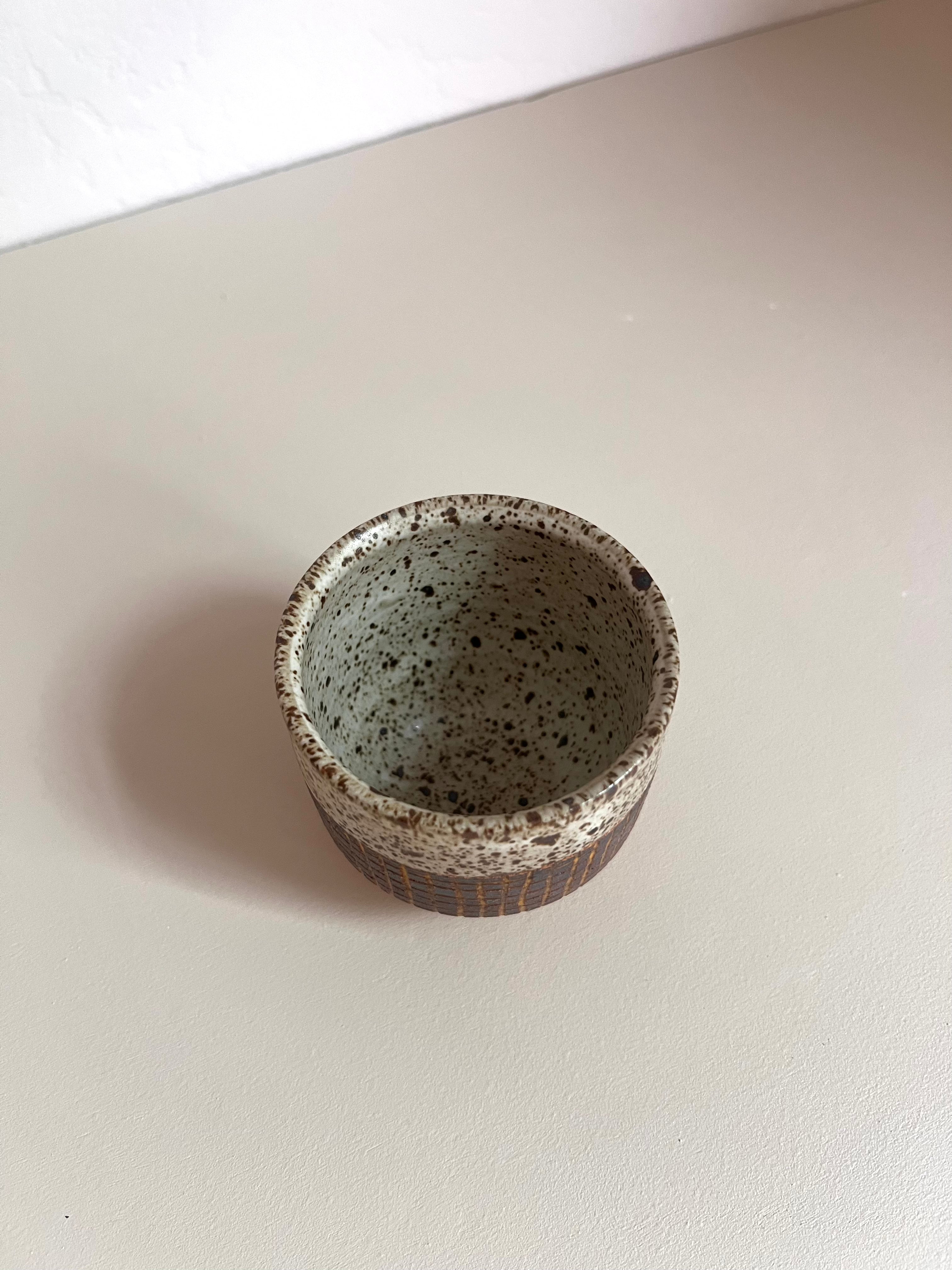 Wheel thrown stoneware, decorated with carving and slip. Finished with a satin white glaze interior. Cone 10, gas reduction fired.