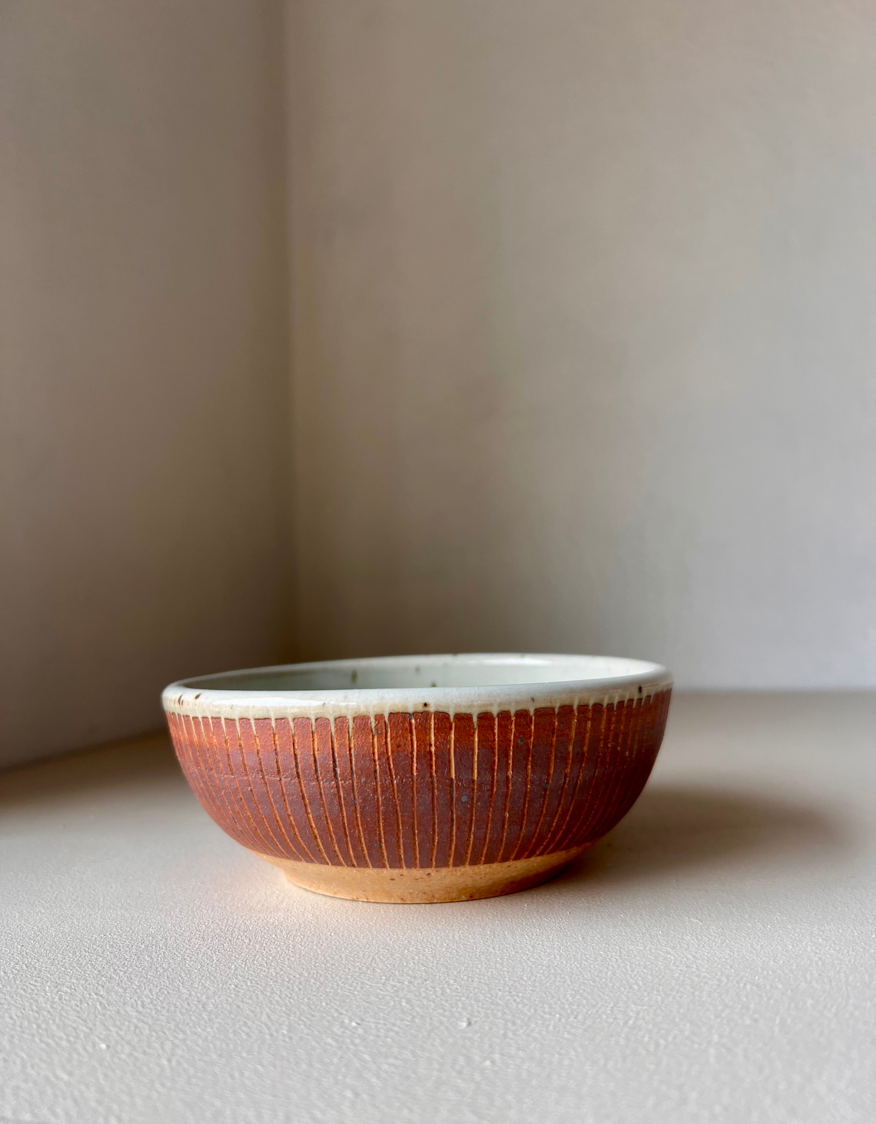 Wheel thrown stoneware, decorated with carving and slip. Finished with a gloss white glaze interior. Cone 10, gas reduction fired.