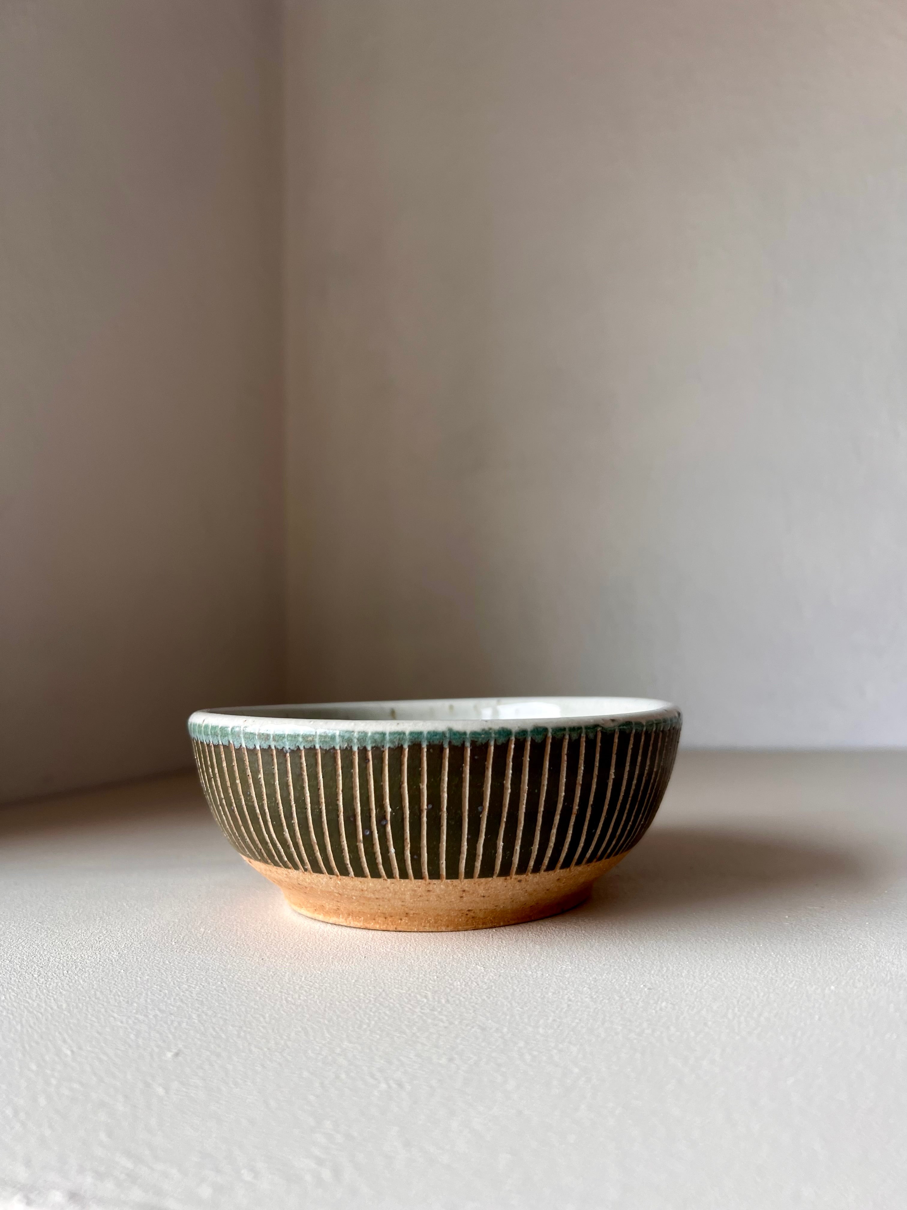 Wheel thrown stoneware, decorated with carving and slip. Finished with a gloss white glaze interior. Cone 10, gas reduction fired.